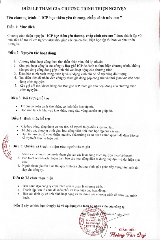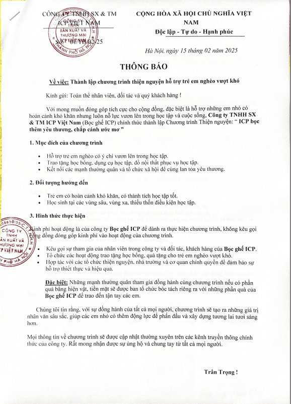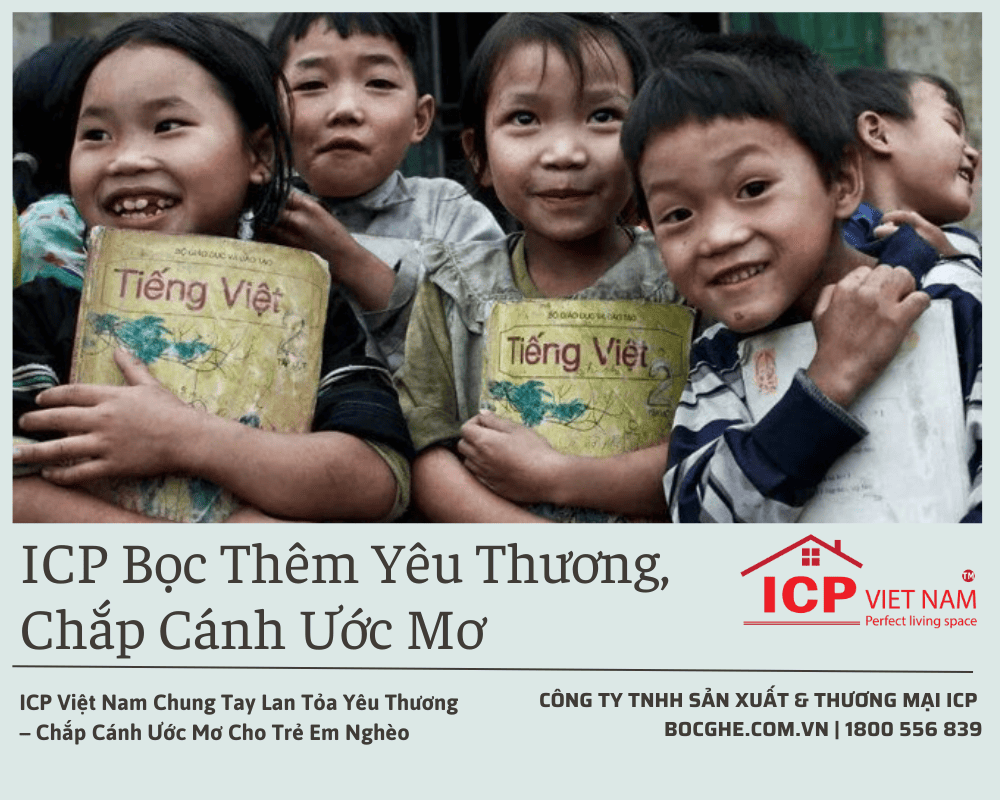 Với tinh thần trách nhiệm xã hội và mong muốn đóng góp cho cộng đồng, Công ty TNHH Sản xuất & Thương mại ICP Việt Nam (Bọc ghế ICP) đã chính thức thành lập chương trình thiện nguyện mang tên "ICP Bọc thêm yêu thương, chắp cánh ước mơ". Đây là một hoạt động ý nghĩa nhằm hỗ trợ trẻ em nghèo vượt khó, giúp các em có điều kiện học tập tốt hơn và phát triển tương lai.